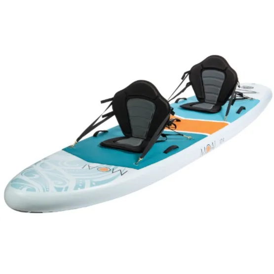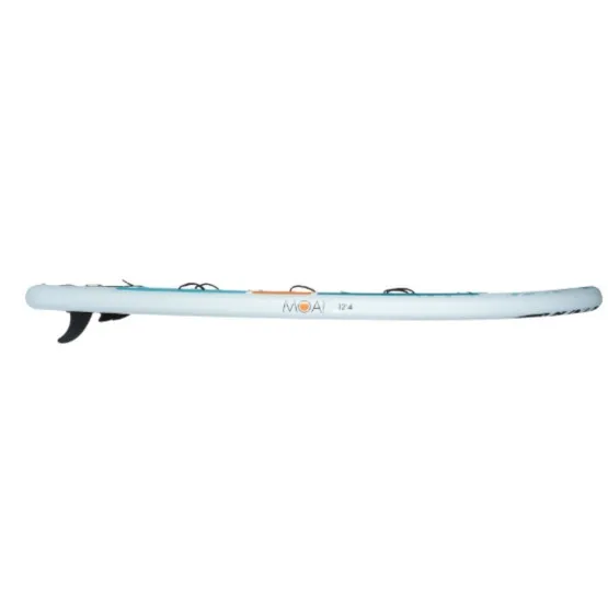 Dwuosobowy, pompowany SUP Moai Multiperson 12’4 zaprojektowany z myślą o rekreacyjnym wiosłowaniu, łączy w sobie paddelboarding z kajakarstwem. W szybki sposób przekształcisz go w sportowy kajak. Jej wielkość gwarantuje wystarczającą ilość miejsca na pokładzie, i mimo swoich gabarytów, deska jest zwrotna i szybka. Wyporność deski wynosi 350 litrów, co daję maksymalne obciążenie 190 kg.