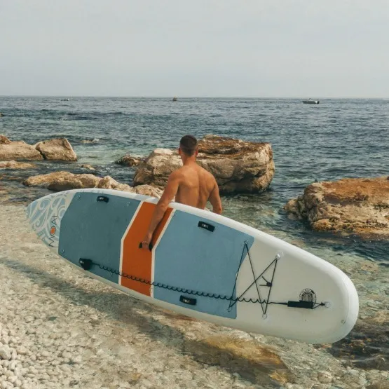 Napompujesz ją do 18 psi. Na rufie posiada elastyczny system linek typu Bungee, dzięki któremu przymocujesz najbardziej potrzebny Ci rzeczy podczas Twojej wyprawy. Deska wyposażona jest w jeden wyjmowany statecznik w systemie US-Box, czyli mocowania za pomocą jednej śruby oraz dwa mniejsze finy, które pomagają w utrzymaniu kursu. Pokład został pokryty pianką EVA, która daje poczucie bezpieczeństwa na pokładzie, chroniąc przed poślizgiem i upadkiem. Oprócz właściwości antypoślizgowych footpad jest przyjemny w dotyku, co pozwala na wylegiwanie się na desce w chwilach przerwy od wiosłowania. Na środku deski znajduje się solidny uchwyt, który ułatwi Ci jej transport oraz kilka D-ringów.
