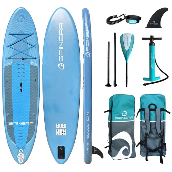 Spinera Lets Paddle 10’4 to kompaktowa deska SUP idealna do rekreacyjnego pływania na jeziorach, rzekach i spokojnych wodach morskich. Dzięki wytrzymałej konstrukcji HDDS (High Density Dropstitch) jest stabilna i trwała, a jednocześnie wystarczająco lekka, by łatwo ją przenosić. W zestawie znajdziesz: deskę, 3-częściowe aluminiowe wiosło, statecznik, pompkę i plecak. Wymiary deski: 315×80×15 cm. Max. ciśnienie: 15 psi. Max. obciążenie: 130 kg