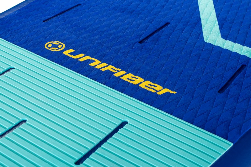 Pokład pokryty antypoślizgową pianką EVA z tłoczonym wzorem, który ułatwia odprowadzanie wody, zapewnia doskonałą przyczepność i chroni przed ślizganiem się. Środkowy pad z fakturą typu diamond, a tylny ryflowany