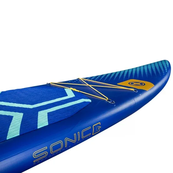 Deska SUP Sonic Touring 12’6 jest dłuższa i węższa niż tradycyjny allround. Jej charakterystyczne proporcje wraz z zaostrzonym dziobem zmniejszają opory i sprawiają, że SUP sprawniej przecina wodę, co odczujesz zwłaszcza na chopie.