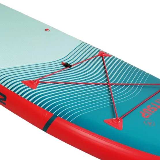 Konstrukcja Drop-Stitch dba o wysoką sztywność przy stosunkowo niskiej wadze, dzięki czemu deska dobrze trzyma kształt i jednocześnie jest łatwa w transporcie. Pokład pokryty pianką EVA zapewnia dobrą przyczepność nawet przy mokrych stopach, a zintegrowane uchwyty D-ring pozwalają na montaż dwóch siedzisk kajakowych – co daje dodatkową możliwość rekreacyjnego spływu na siedząco.