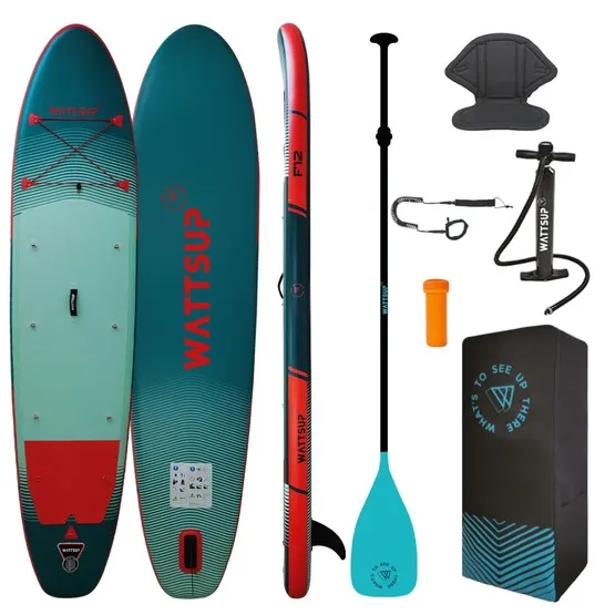 WattSUP F12 to deska SUP do rekreacyjnego pływania dla dwóch osób, idealna na spokojne wypady oraz dłuższe trasy. Dzięki kompatybilności z siedziskami kajakowymi możesz łatwo przekształcić ją w wygodny kajak, a pokład z pianki EVA zapewni Wam dobrą przyczepność i komfort nawet przy dłuższym użytkowaniu. Kompletny zestaw zawiera: plecak, wiosło, ręczną pompkę, leash oraz zestaw naprawczy.
