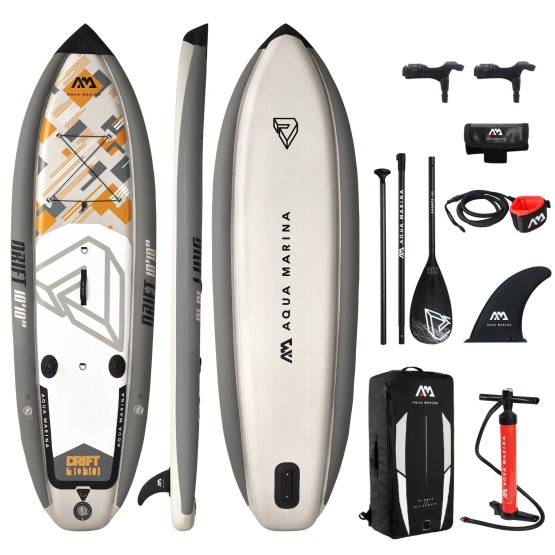 Aqua Marina Drift 10’10 to model dedykowany miłośnikom wędkarstwa, którzy znajdą w nim wszystko, co niezbędne, by spędzić godziny na ulubionym łowisku. Specjalnie na potrzeby wędkowania Drift został wyposażony w dwa uchwyty do wędek oraz możliwość zamontowania przenośnego siedziska z oparciem z wbudowaną lodówką turystyczną (siedzisko-lodówka sprzedawana osobno).