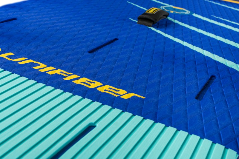 Pokład pokryty antypoślizgową pianką EVA z tłoczonym wzorem, który ułatwia odprowadzanie wody, zapewnia doskonałą przyczepność i chroni przed ślizganiem się. Środkowy pad z fakturą typu diamond, a tylny ryflowany
