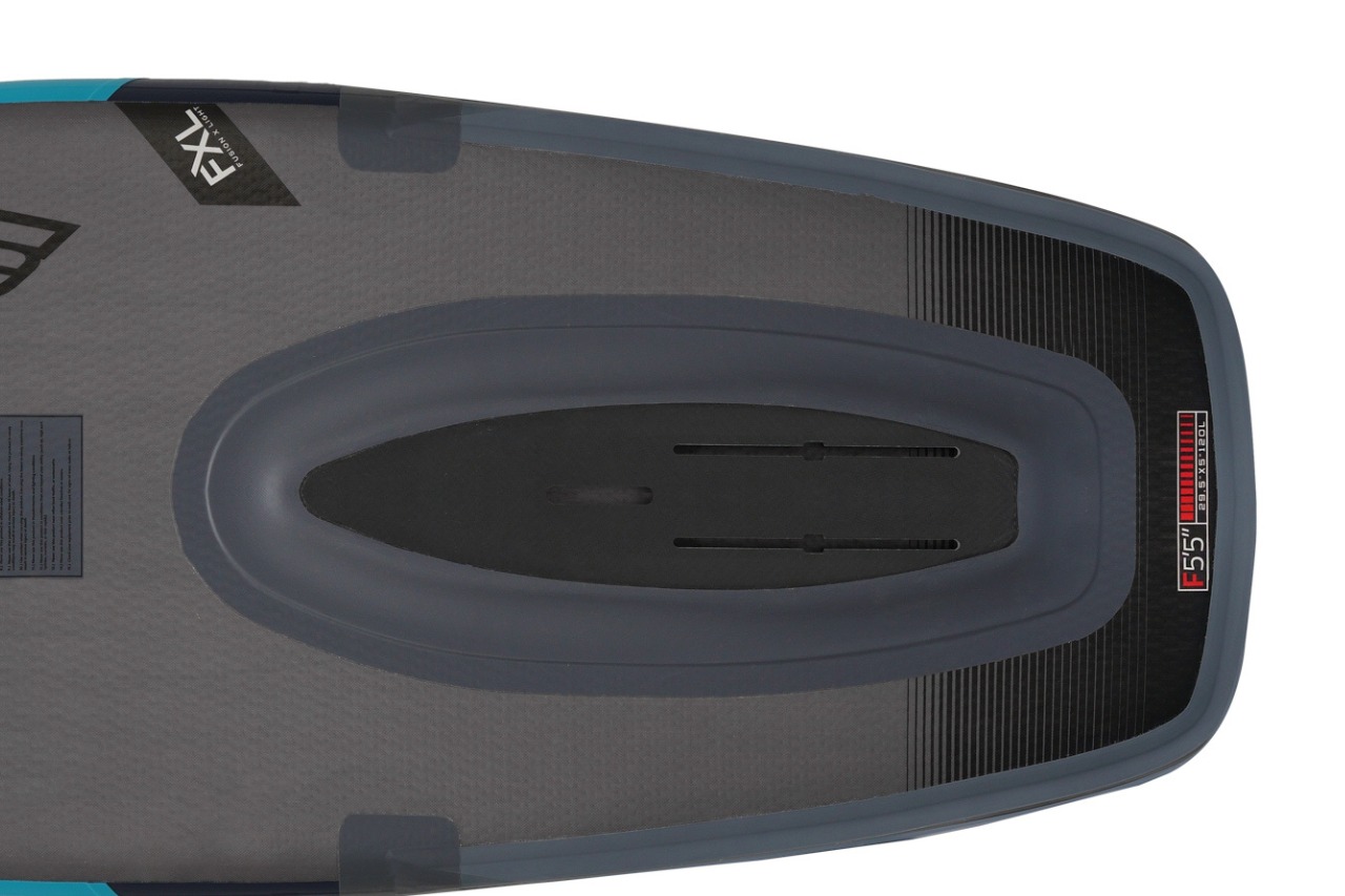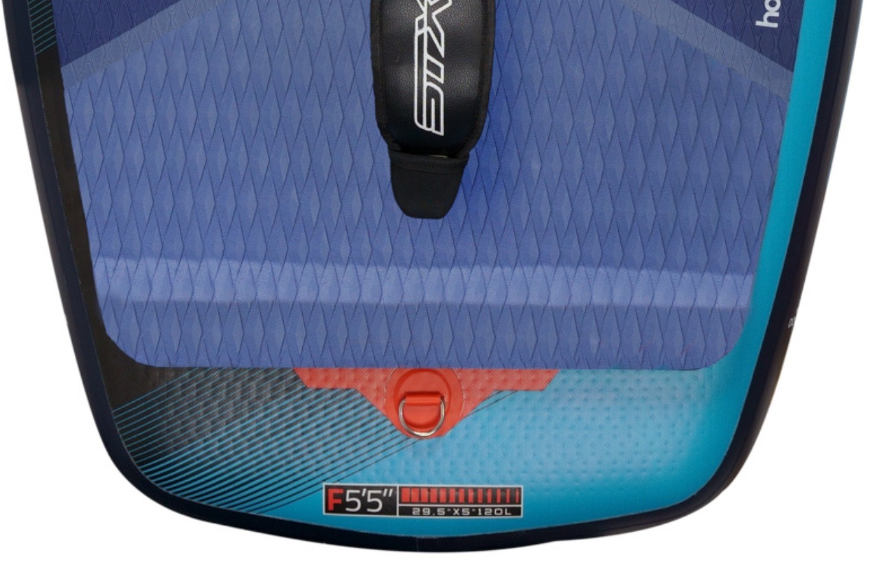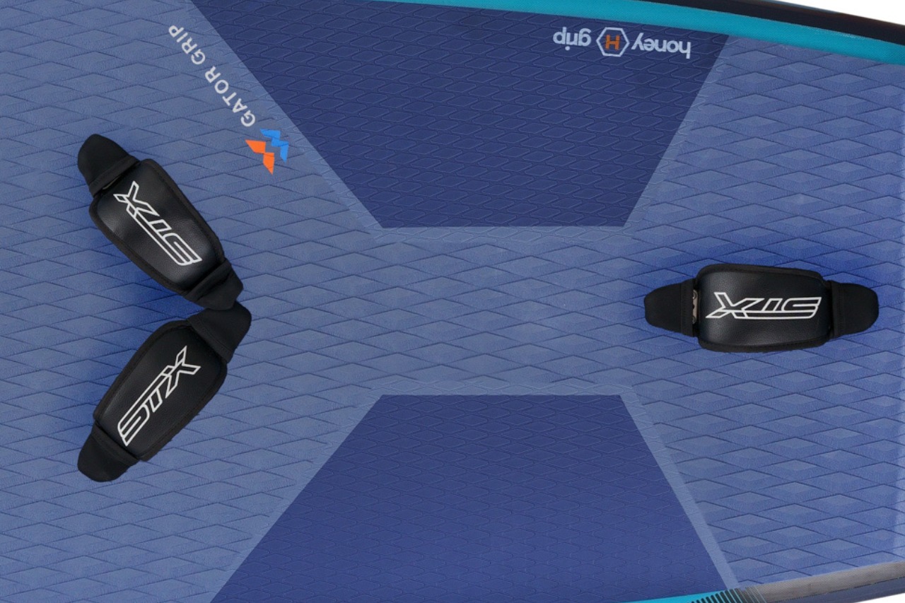 Dno wyposażone w karbonową płytę ze skrzynką Foil Track (system 90 mm z 4 śrubami) gwarantuje kompatybilność z foilami najważniejszych marek, np. Duotone, F-One czy NeilPryde. Railsaver (prosta krawędź rufy) poprawia uwalnianie wody spod deski, ułatwiając oderwanie się i wczesne starty. Tegoroczny model posiada dwie struktury footpada: Core Grip pod stopami oraz bardziej komfortowy Honey Grip pod kolanami. Regulowane footstrapy oraz inserty na pokładzie pozwalają dostosować ich ustawienia do umiejętności i stylu jazdy ridera. STX iFoil występuje w aż 5 rozmiarach, by zagwarantować idealne dopasowanie.