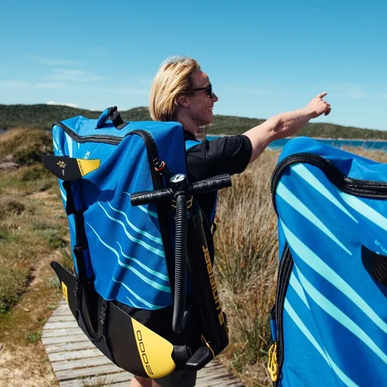 Niewielkie rozmiary po złożeniu to wygoda przechowywania oraz łatwy transport. Deska wraz z akcesoriami (m.in. pompka, stateczniki) mieści się w ergonomicznym solidnym plecaku dołączonym do zestawu