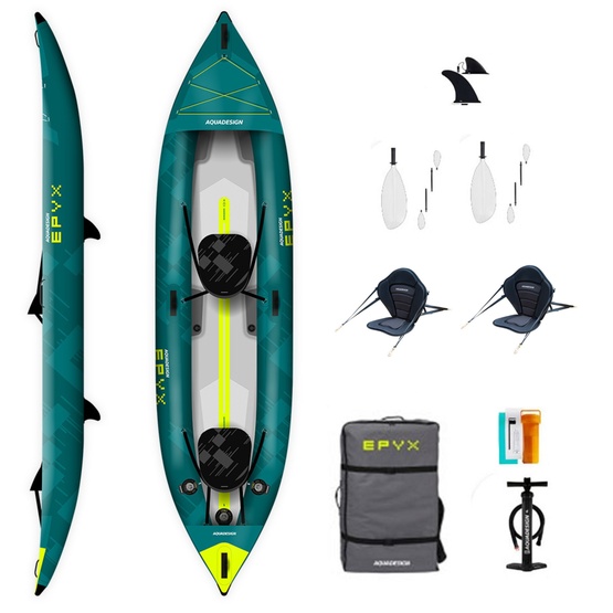 Aquadesign EPYX 380 to dwuosobowy kajak pompowany do spokojnych wypraw po morzu, jeziorze i rzekach o trudności do klasy II. Sztywna podłoga drop-stitch i tuby z PVC 1100 DTEX zapewniają dużą stabilność i komfort podczas dłuższych wycieczek. Wymiary kajaka: 380×96×42 cm. Max. ciśnienie: 10 PSI (podłoga) / 3,5 PSI (tuby).