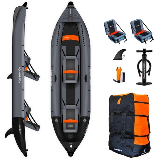 Aquadesign KOLOA 400 to trzyosobowy, półprofesjonalny kajak pneumatyczny do użytku na morzu, jeziorach i rzekach do klasy III. Szeroki kadłub i podłoga drop-stitch 10 cm zapewniają dużą stabilność i komfort pływania nawet z dziećmi. W zestawie: torba transportowa, pompka wysokociśnieniowa, 3 siedziska fusion, 2 stateczniki i zestaw naprawczy. Max. obciążenie 250 kg.