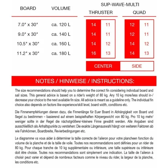 Stateczniki SUP-Wave-Multi są wynikiem intensywnej współpracy z duńskim ekspertem w dziedzinie windsurfingu i SUP – Larsem Petersenem. Idealnie sprawdzają się w układach Thruster i Quad. Gwarantują super płynne i dynamiczne pokonywanie zakrętów na fali.
