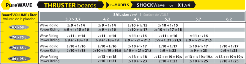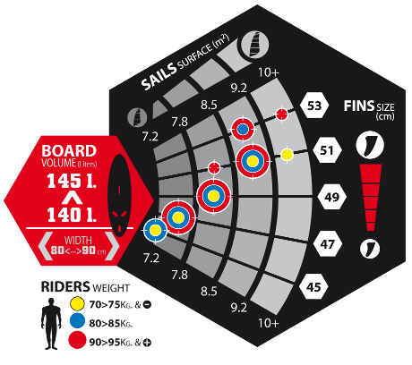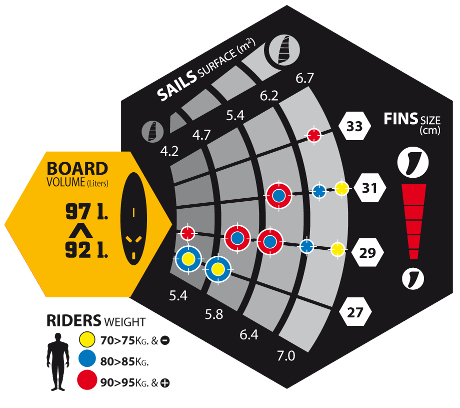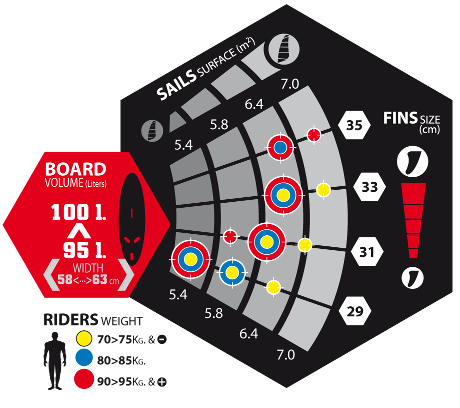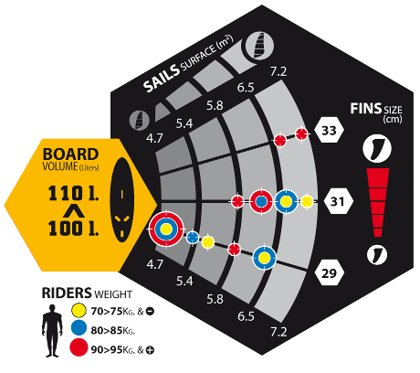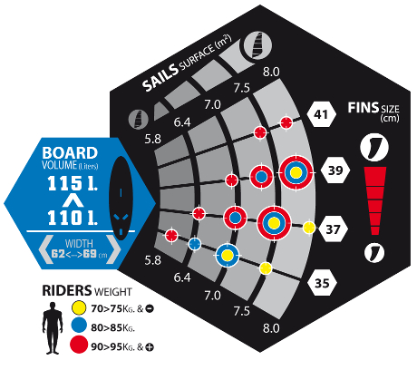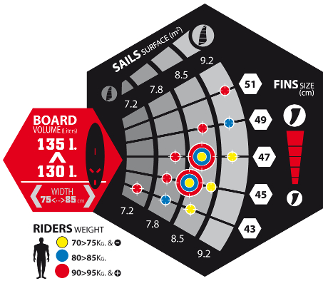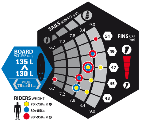 Wybierz odpowiednią wyporność/szerokośc deskiWybierz właściwy rozmiar żaglaZidentyfikuj kolor kropki odpowiadający Twojej wadzePołączenie powyższych punktów pozwoli dobrać odpowiednią długość statecznika