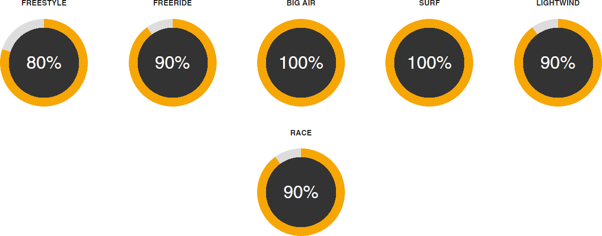 Rozwartość skrzydła została dobrana tak, aby oferować doskonałą moc przy wysokiej stabilności, co jest szczególnie odczuwalne podczas kontroli winga za przednią rączkę na fali