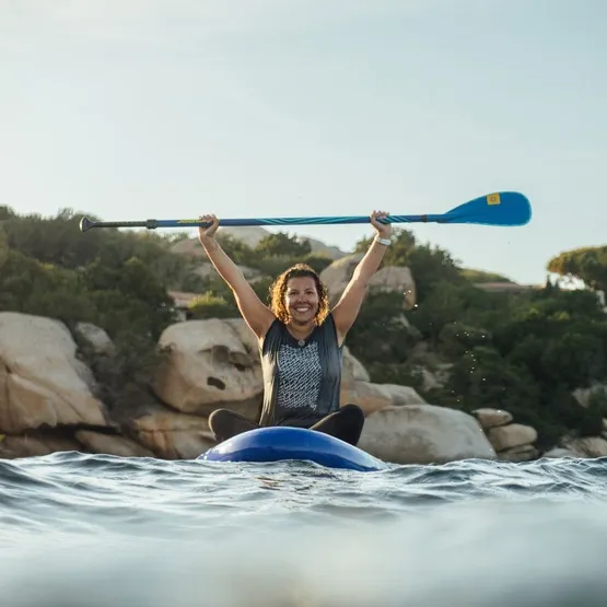 Wiosło wyróżnia się wykończeniem trzonka pianką EVA, która ma właściwości antypoślizgowe i zapewnia pewny chwyt. Dodatkowo zwiększa wyporność całego wiosła, jest przyjemna w dotyku i eliminuje potencjalne zarysowania deski.