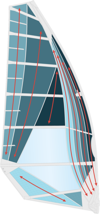Ta innowacyjna konstrukcja wykorzystuje ciągłe panele ułożone wzdłuż naturalnych linii naprężeń w żaglu, eliminując szwy poprzeczne dla lepszego rozkładu obciążenia, zwiększonej stabilności i lepszej responsywności.