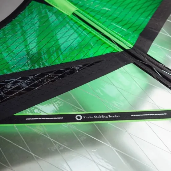 3-warstwowe radiale na topie, w rogu szotowym i rogu halsowym rozchodzą się do centralnej części żagla, wykonanej w całości z X-Ply, zapewniając najwyższą odporność i optymalny rozkład naprężeń w ciężkich warunkach surf.