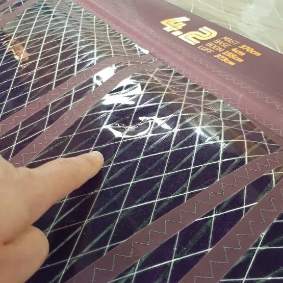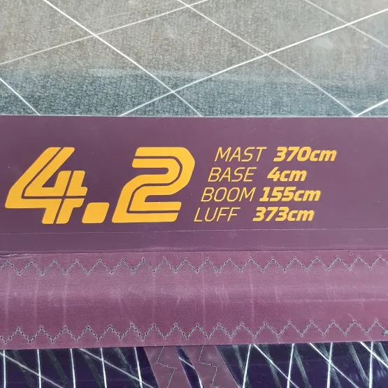 | Powierzchnia (m²) | Luff (cm) | Bom (cm) | Przedłużka (cm) | Maszt | Listwy | Kambery | Vario top | Waga (kg) |
